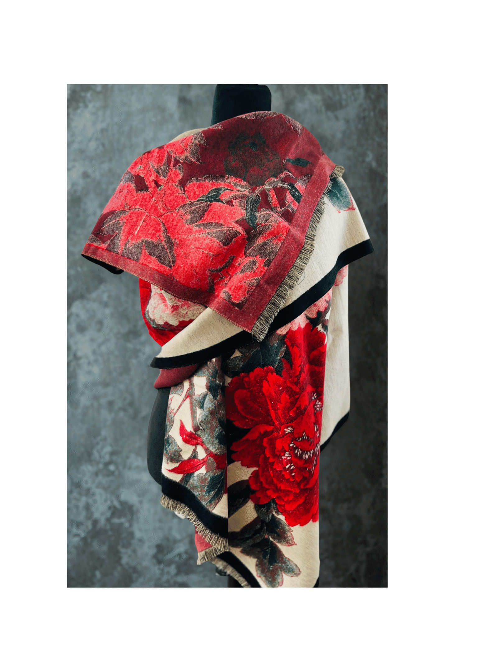A striking contrast of red and black floral patterns creates an air of vintage romance in this elegant scarf.